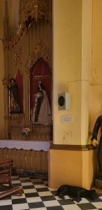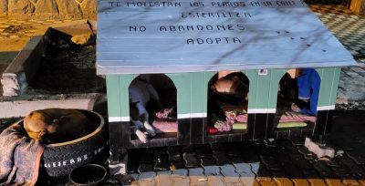 Ya de noche, camino al hotel, descubrimos con sorpresa y alegría un refugio para perros callejeros en una esquina de la plaza: casitas muy limpias y cuidadas, con mensajes claros y directos.