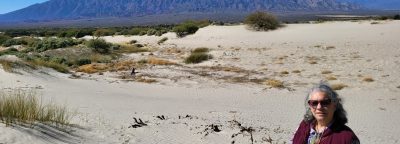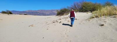 Salimos en busca de los Médanos, formaciones de arena blanca con mucha mica que brilla al sol. Cubren un área de 20 kilómetros cuadrados y tiene caprichosas formas que el viento mueve a su antojo. Había llovido días antes, por lo que los caminos estaban anegados. Debimos dejar el coche lejos e internarnos por senderos bordeados de vegetación “nada amistosa” para llegar. He de decir que disfrutamos del paisaje por la perseverancia de mi esposo, que insistió en seguir andando esos agrestes senderos hasta dar con los Médanos. Al regreso al hotel, se sorprendieron que pudiéramos llegar sin perdernos, gracias a la experiencia de montañero de mi marido.